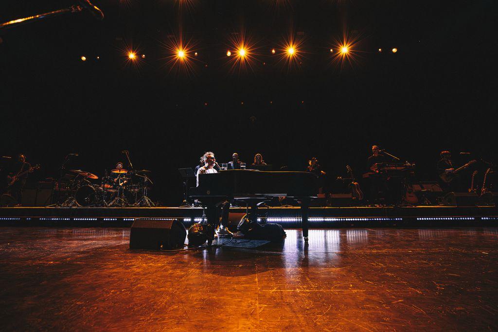 En el escenario, el ídolo del rock estuvo acompañado por un grupo de ocho músicos, incluyendo una sección potente de vientos, una corista y su acostumbrado piano, que fue uno de los protagonistas de la noche y acompañó a Fito durante casi todo el concierto.