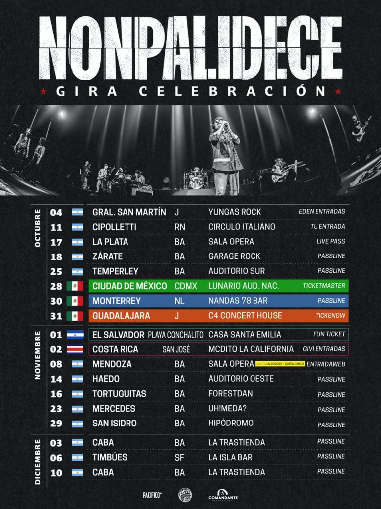 | Este estreno llega en un año clave para el grupo. El pasado 21 de septiembre, se presentaron con un show inolvidable en el Konex y cumplieron 29 años de banda. Además, siguen compartiendo su música con su “Gira Celebración” Con el tour la banda continúa expandiendo su música dentro y fuera del país. Después de presentarse en diversas ciudades de Argentina, Nonpalidece emprenderá viaje a México, donde debutará en el Lunario Auditorio Nacional de Ciudad de México el 28 de octubre, para luego presentarse el 30 en Monterrey y el 31 en Guadalajara. La gira contará además con la participación especial de Ras Kuko, quien estará presente únicamente en dos fechas de Argentina: el 17 de octubre en el Teatro Ópera de La Plata y el 18 de octubre en Garage Club, Zárate . Ras Kuko es un artista nacido en Madrid, radicado en las Islas Canarias y fundador de la mítica banda española Cañaman, uno de los grupos pioneros del reggae en España. Con más de 30 años de trayectoria como cantante, músico, productor y compositor, Ras Kuko suma su experiencia internacional al recorrido de Nonpalidece. El calendario de shows seguirá en noviembre por Centroamérica: El 1 en El Salvador, y el 2 en Costa Rica. Luego, regresan a Argentina para continuar con una serie de shows imperdibles en Mendoza, Haedo, Tortuguitas, Mercedes, San Isidro y Buenos Aires. |