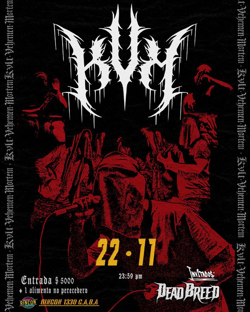 K.V.M (Kvlt Vehemen Mortem) es una banda de metal extremo oriunda de la Ciudad de Buenos Aires, formada en 2021 e integrada por seis músicos. Con apenas unos años de recorrido dentro de la escena under, el proyecto comenzó a ganar reconocimiento por su impronta explosiva en vivo, y una puesta en escena que no pasa desapercibida: durante cada show, los integrantes aparecen completamente cubiertos de negro – piel pintada, caras ocultas con una tela oscura – reforzando la identidad visual que acompaña la atmósfera del proyecto y del sonido.