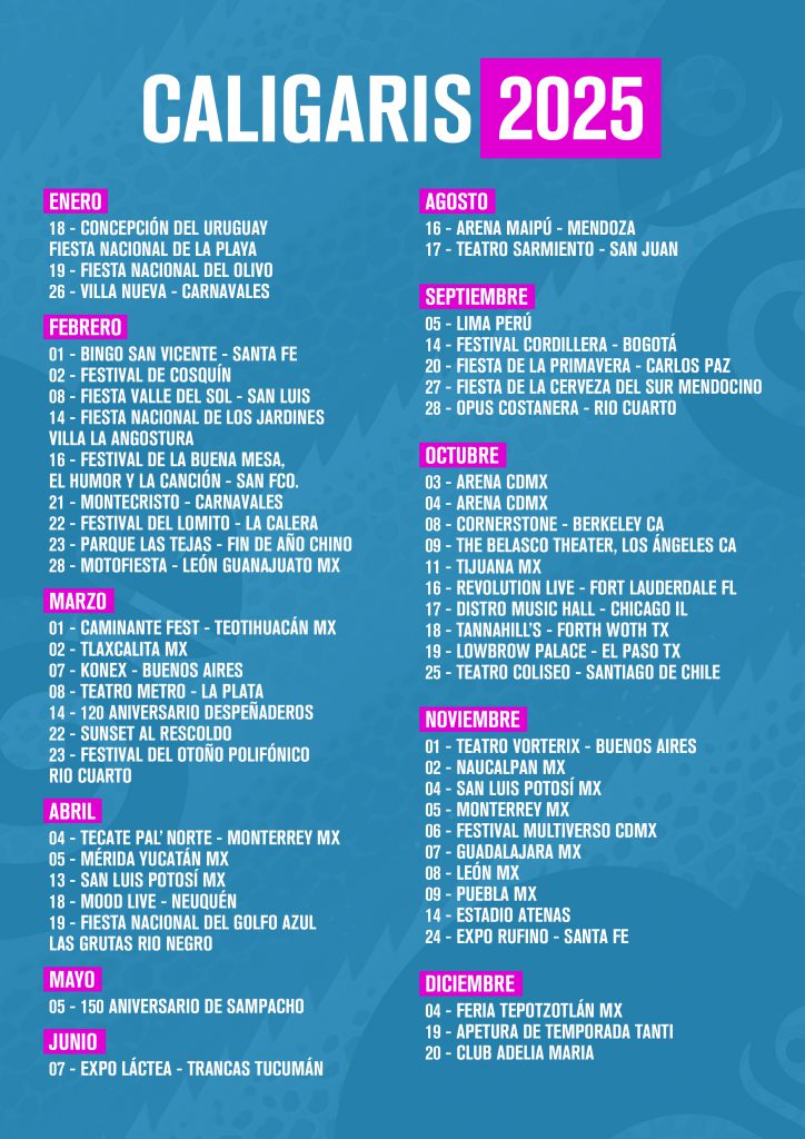 Los Caligaris despiden un 2025 extraordinario, un año que reafirmó su lugar como una de las bandas más queridas y convocantes de la región. Su recorrido internacional los llevó por México, Estados Unidos, Chile, Colombia, Perú, Argentina y más, con una respuesta contundente en cada escenario.