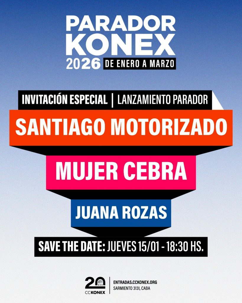 | El próximo jueves 15 de enero a las 18:30 hs, Parador Konex 2026 se presenta oficialmente con un evento lanzamiento que ya se perfila como una de las fechas clave del verano porteño. En el patio de CC Konex (Sarmiento 3131, CABA), el atardecer será el escenario perfecto para una grilla que cruza generaciones y sensibilidades: Santiago Motorizado, Mujer Cebra y Juana Rozas se reúnen para darle inicio a una nueva temporada del único festival que dura todo el verano. Pensado como un punto de encuentro para escaparle a la rutina y dejarse llevar por el clima del verano en la ciudad, el lanzamiento de Parador Konex 2026 propone una experiencia que va más allá de los shows: llegar temprano, quedarse hasta que caiga la noche y ser parte de la primera gran cita del ciclo. Las entradas ya están a la venta en la web de CC Konex , y todo indica que será una de esas fechas que conviene no dejar pasar. |
