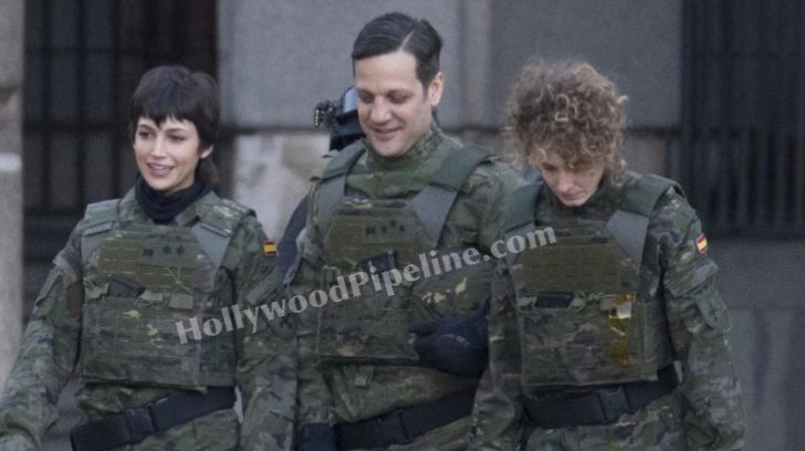 En las fotos se puede ver a De la Serna y a sus compañeros vestidos con ropa militar y chalecos de la guardia civil española, lo que funciona como adelanto de lo que se verá en la trama.