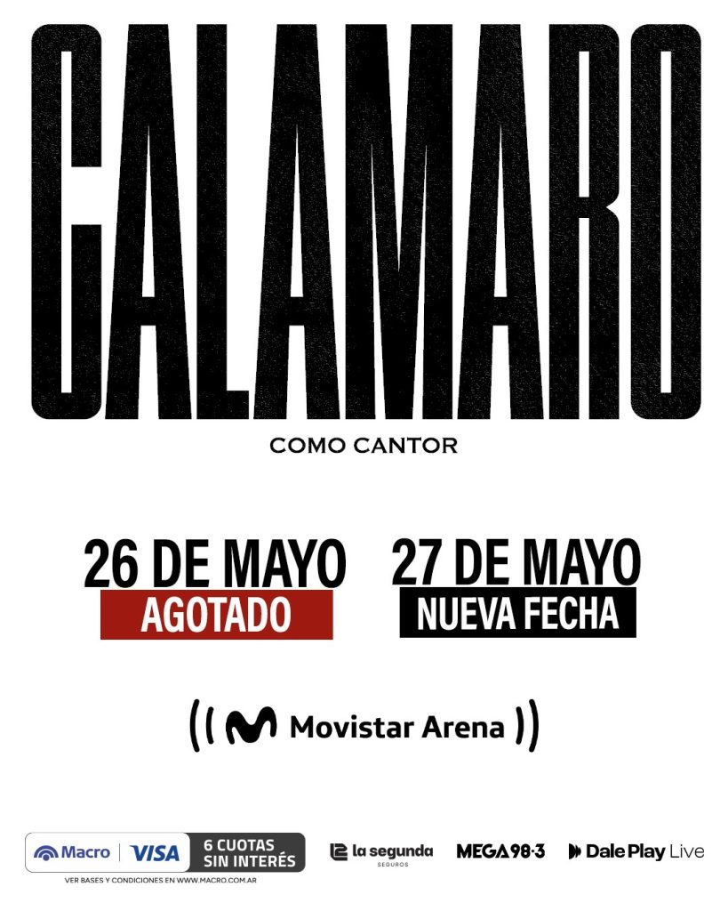 Además, Calamaro confirmó fechas en La Rioja en Loisc Plataforma, Mar del Plata en el Polideportivo, Bahía Blanca en el Dow Center y finalmente regresará con dos fechas al Movistar Arena de Buenos Aires.